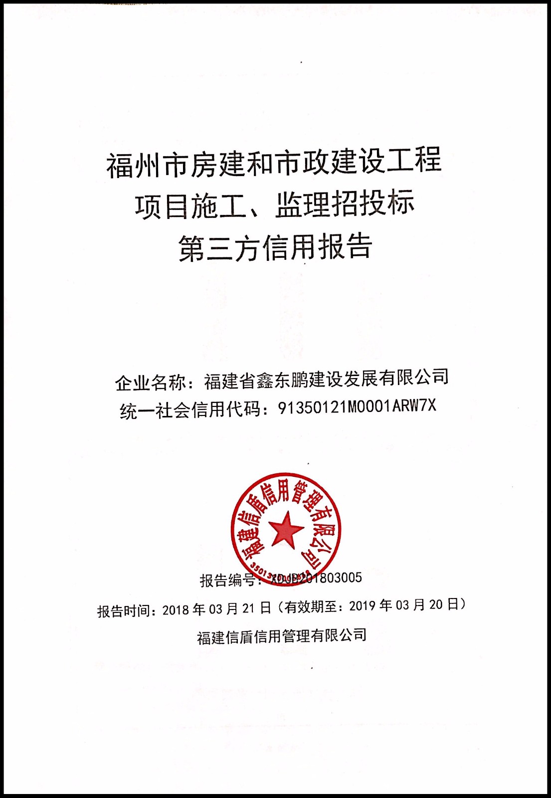 福建省鑫東鵬建設發展有限公司 XDJB201803005